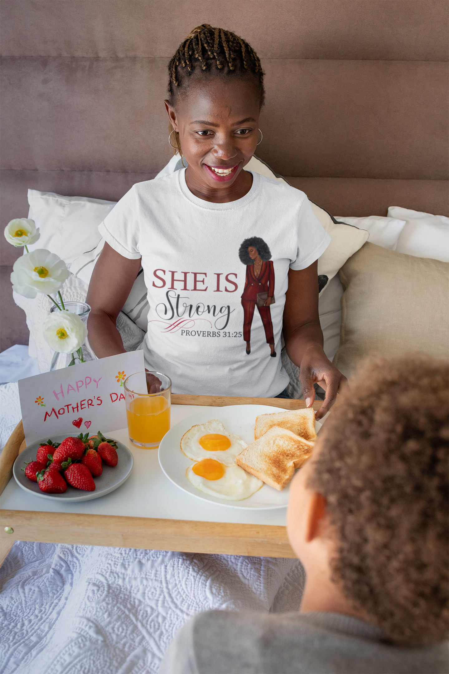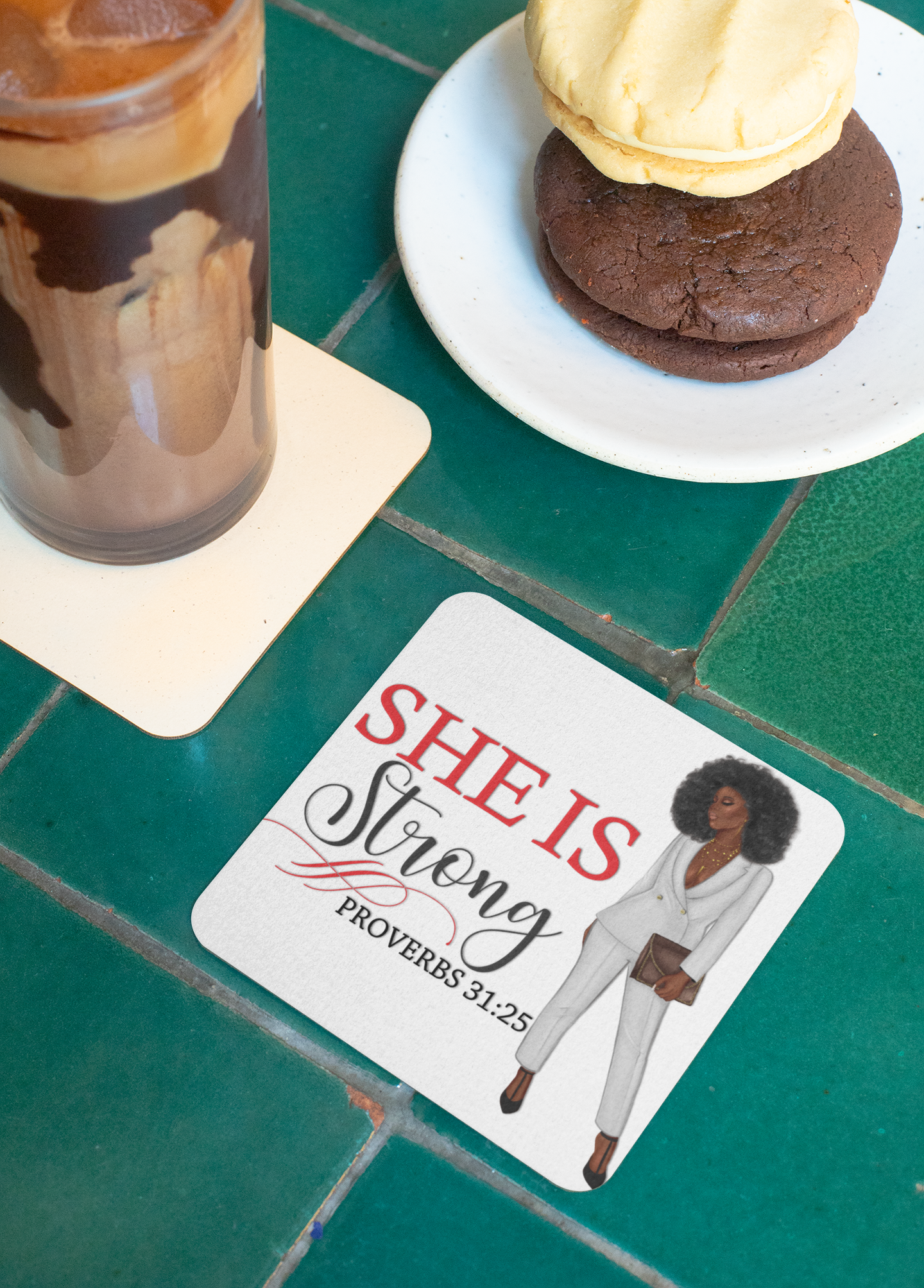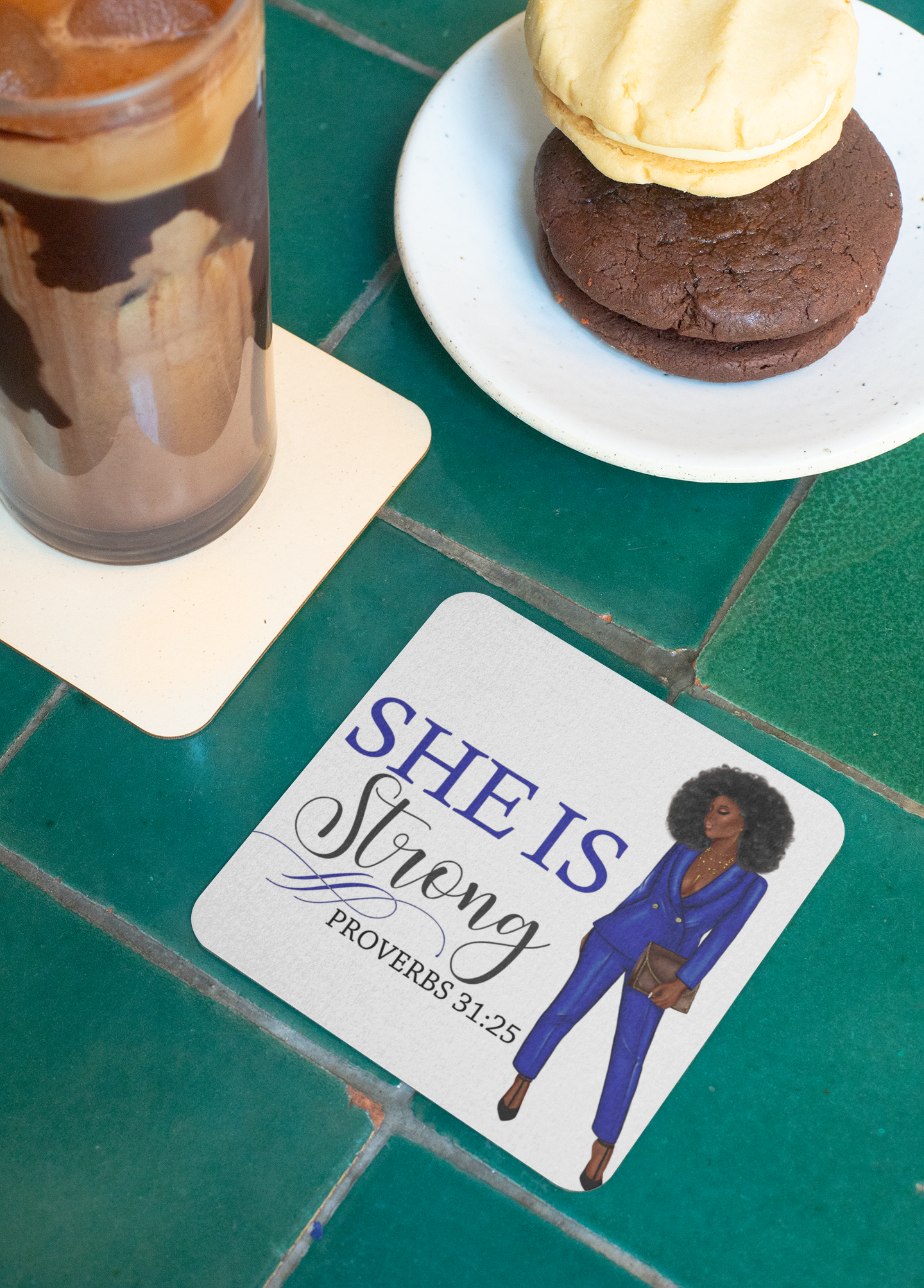 $50 "She is Strong" AFRO hairstyle designed bundle consists of a T-shirt w/design, 1 coffee mug and 1 coaster all with the same design.