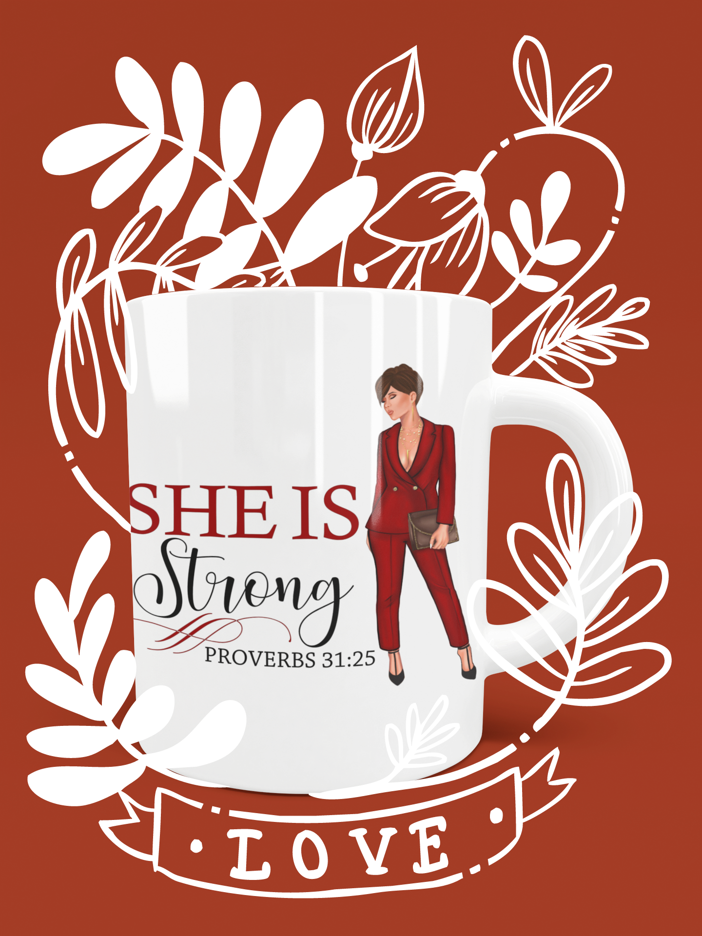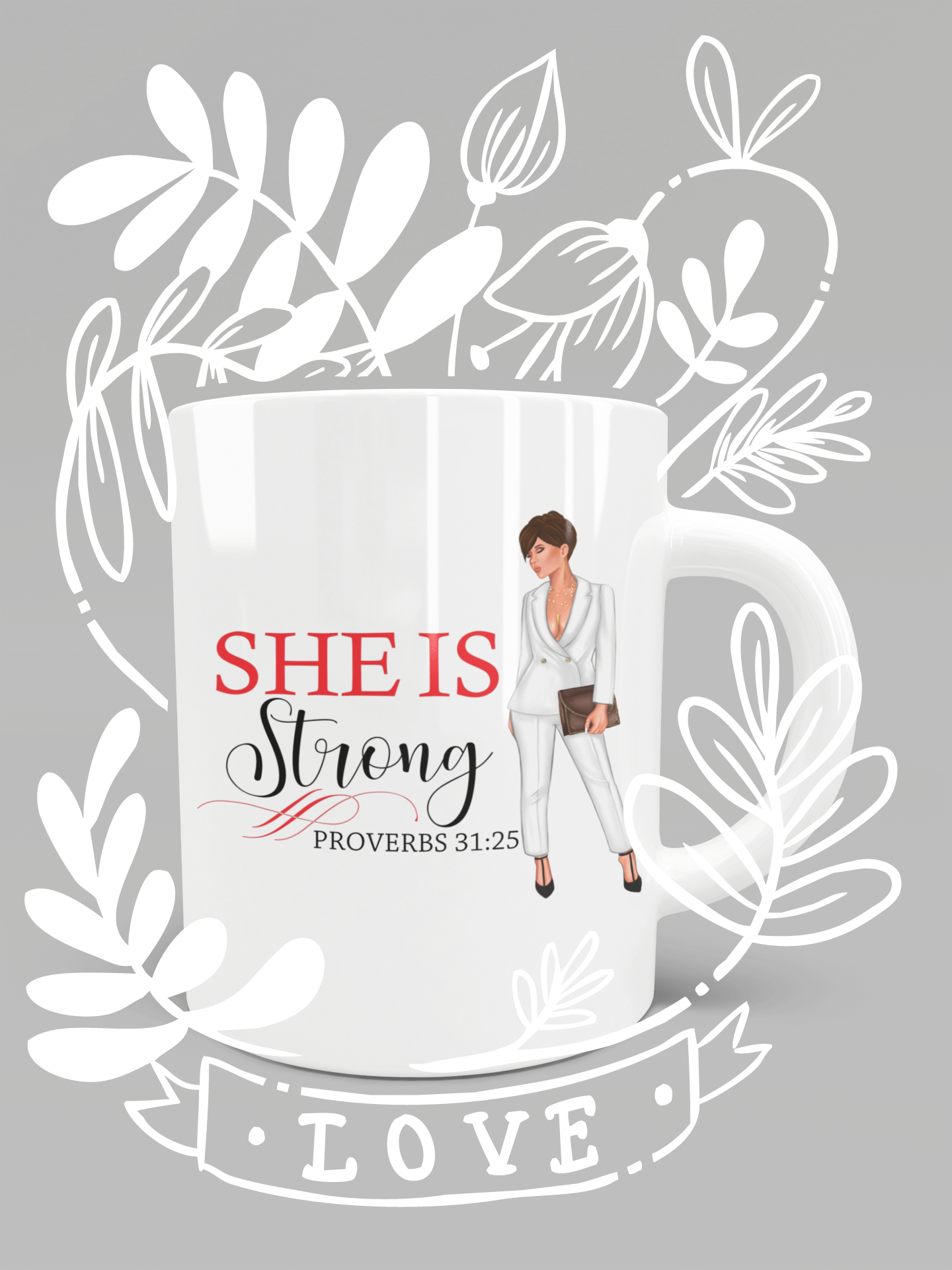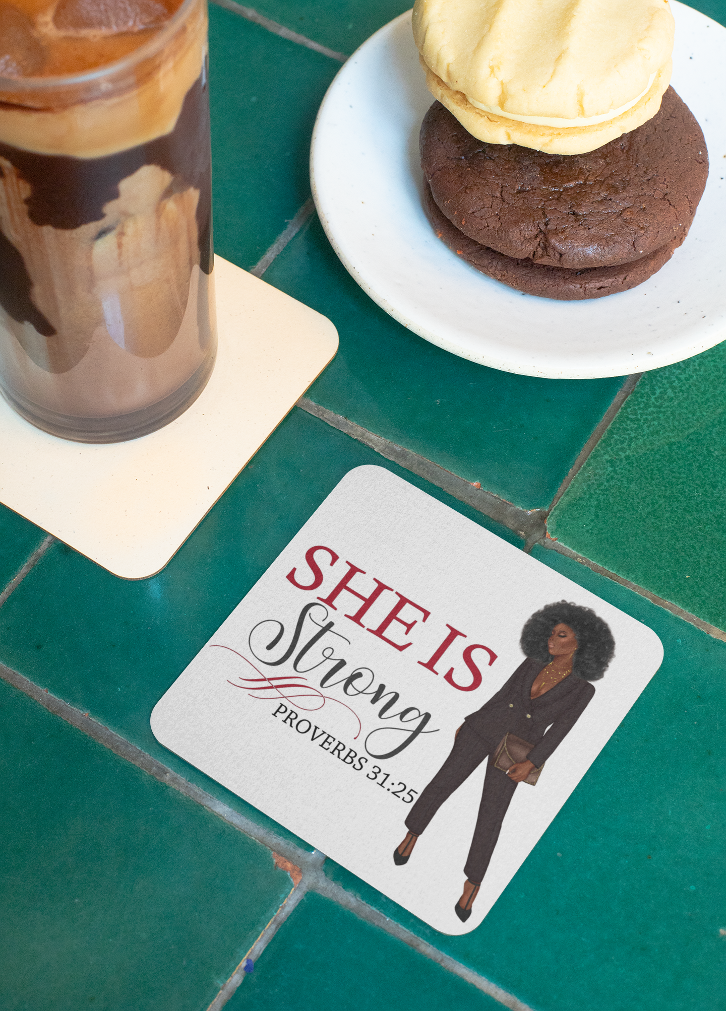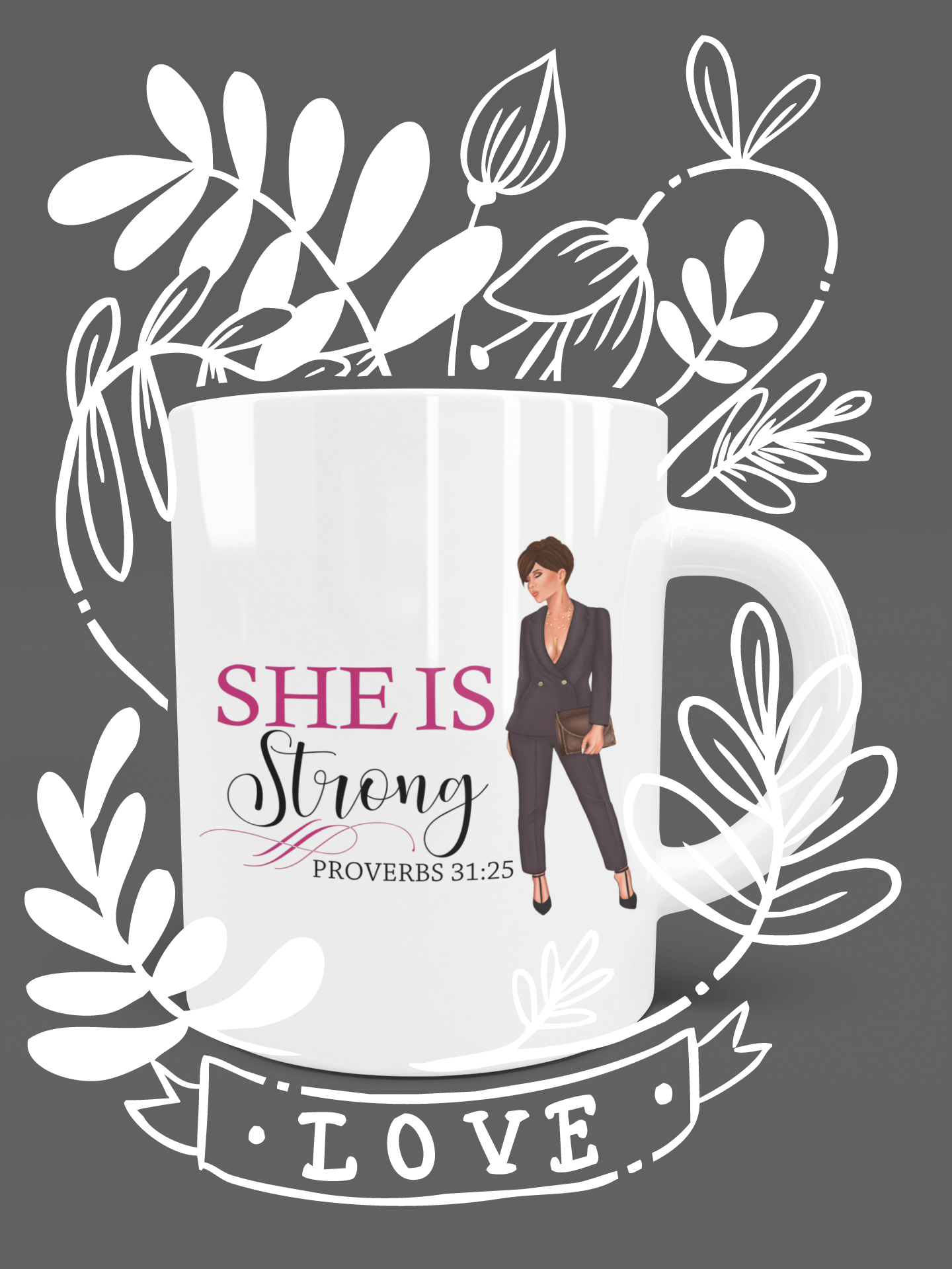 $50 "She is Strong"Caucasian/Latino Bob hairstyle designed bundle consists of a T-shirt w/design, 1 coffee mug and 1 coaster all with the same design.
