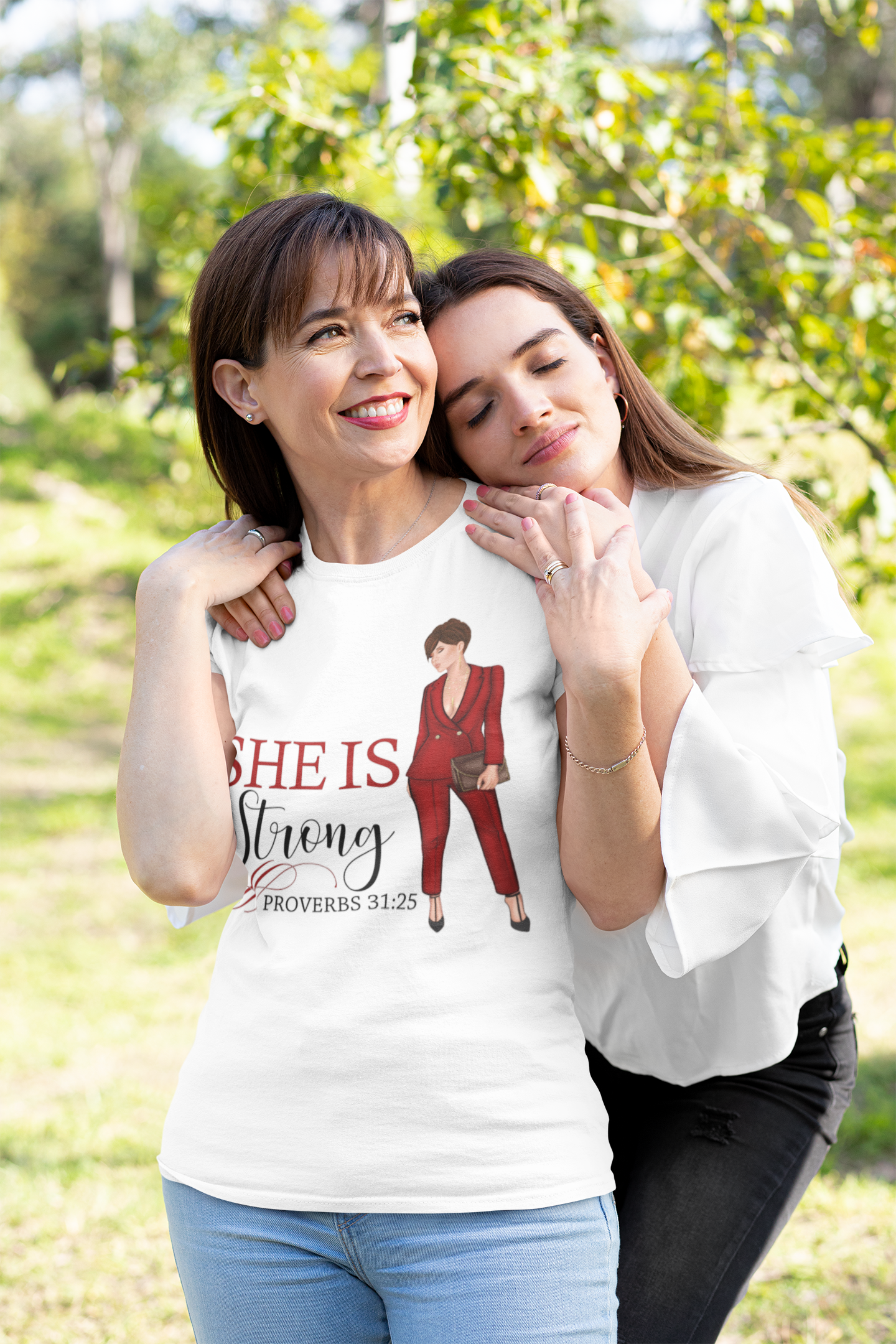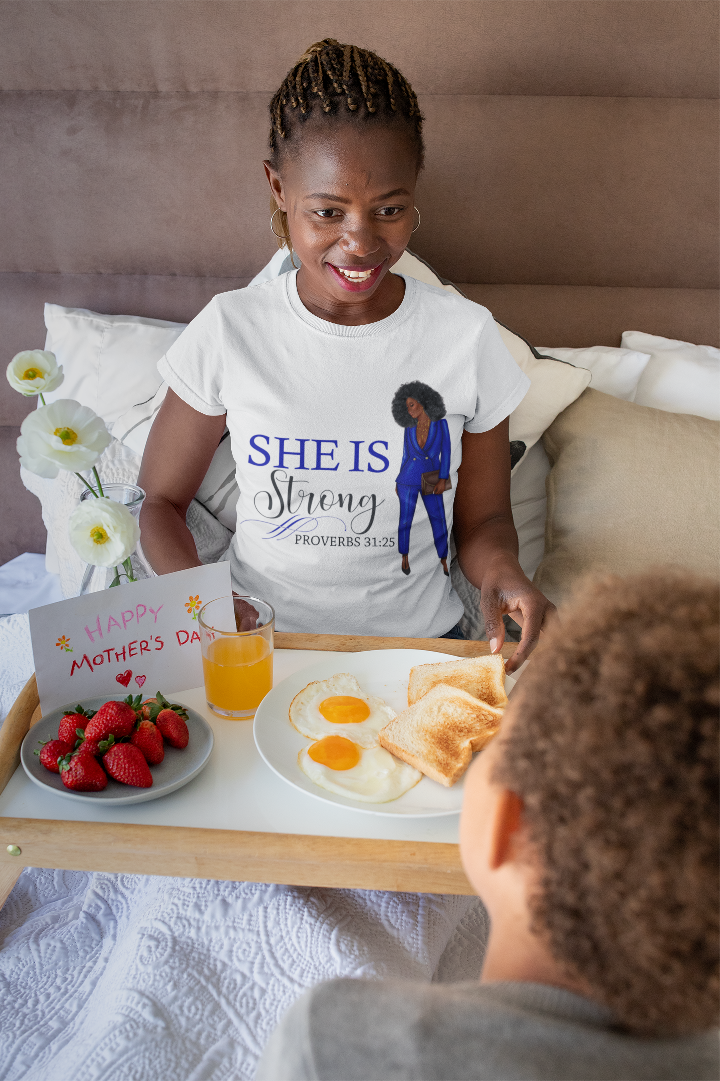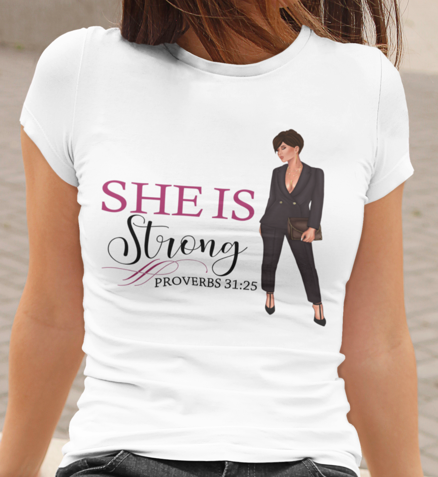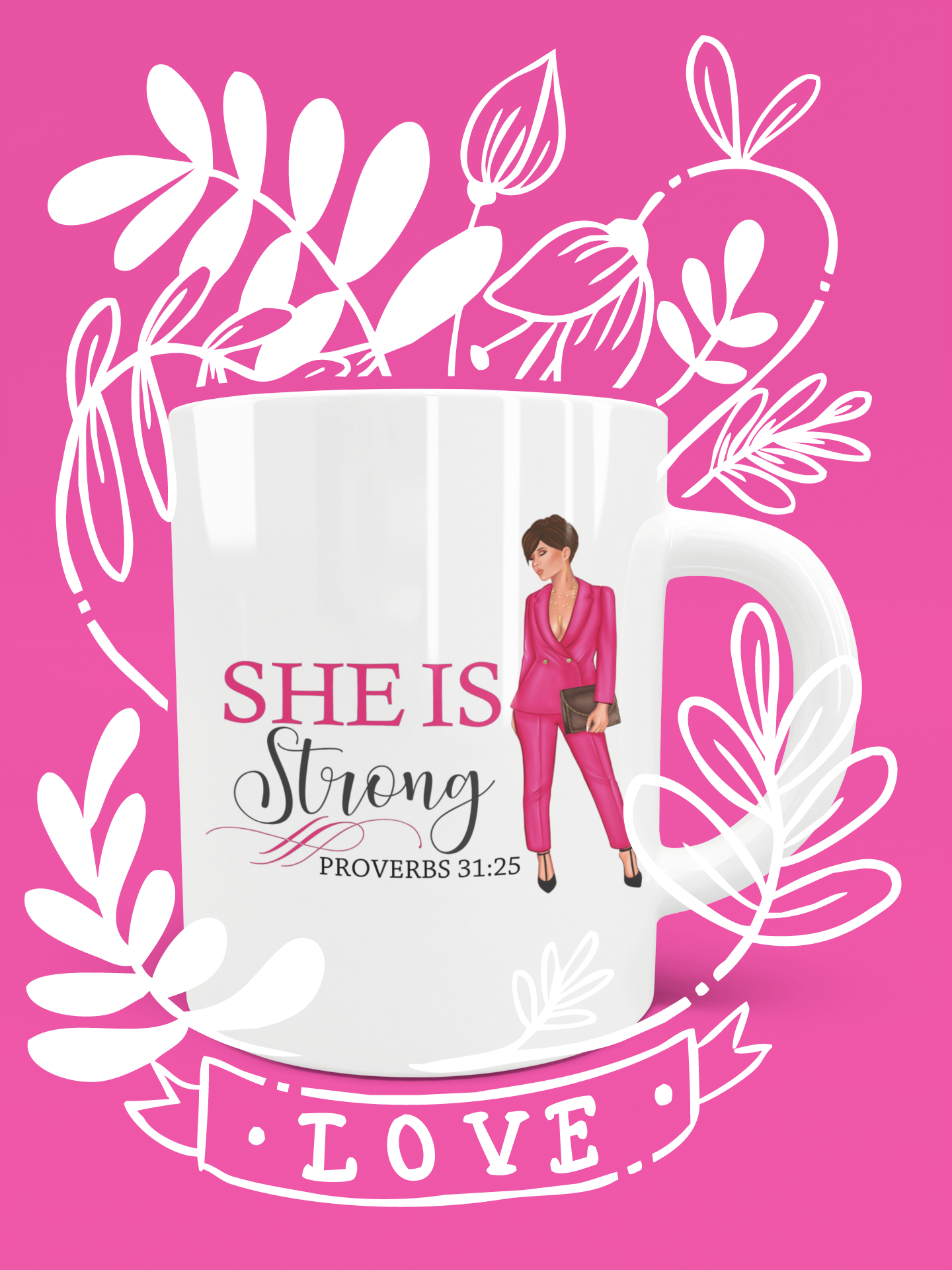 $50 "She is Strong"Caucasian/Latino Bob hairstyle designed bundle consists of a T-shirt w/design, 1 coffee mug and 1 coaster all with the same design.
