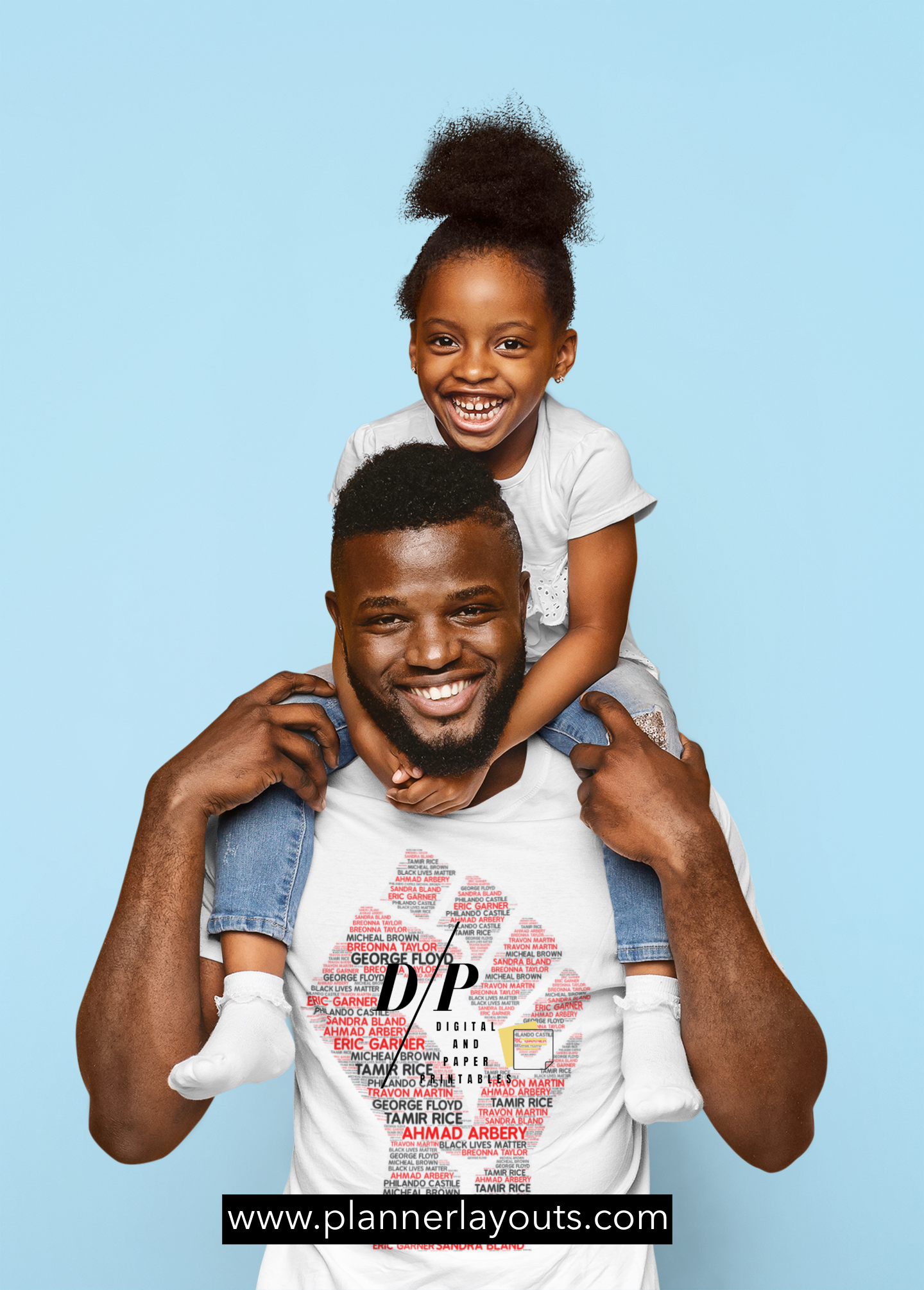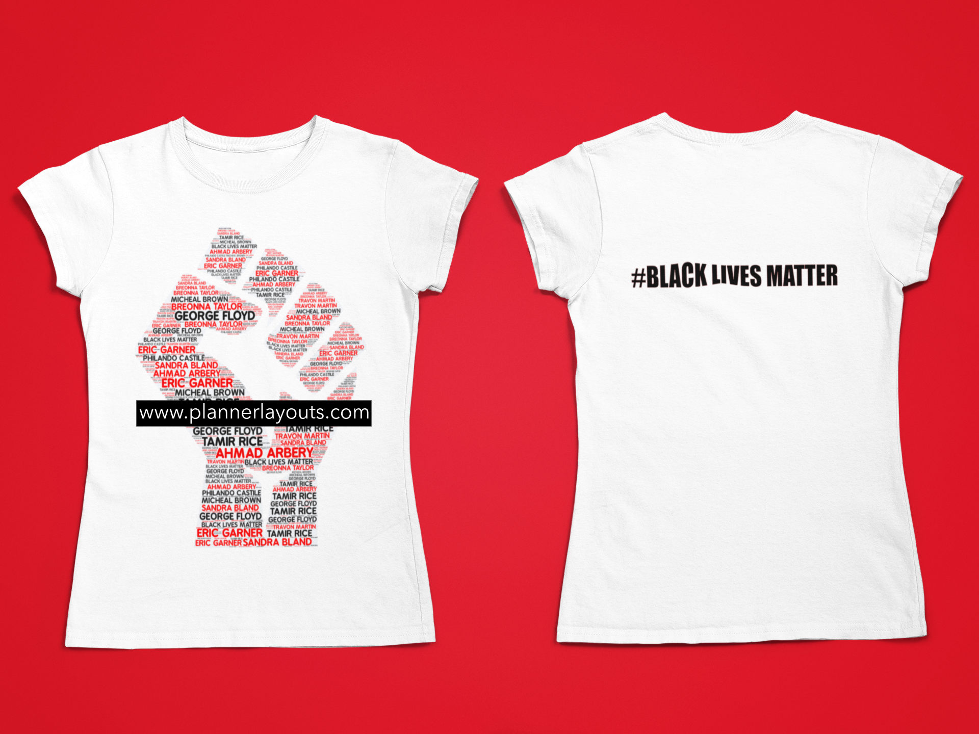 Front of T shirt is designed with the names of black men and women and children who have died as a result of police brutality. The names are designed in the shape of a fist which represents "we will not be forgotten, we demand justice and we will not be silent!"
