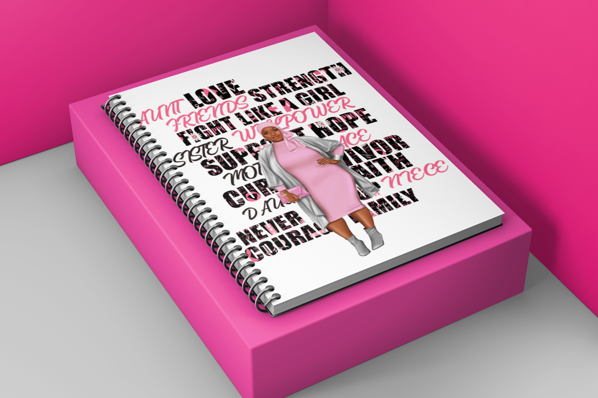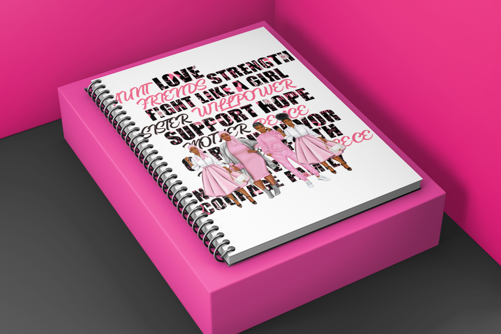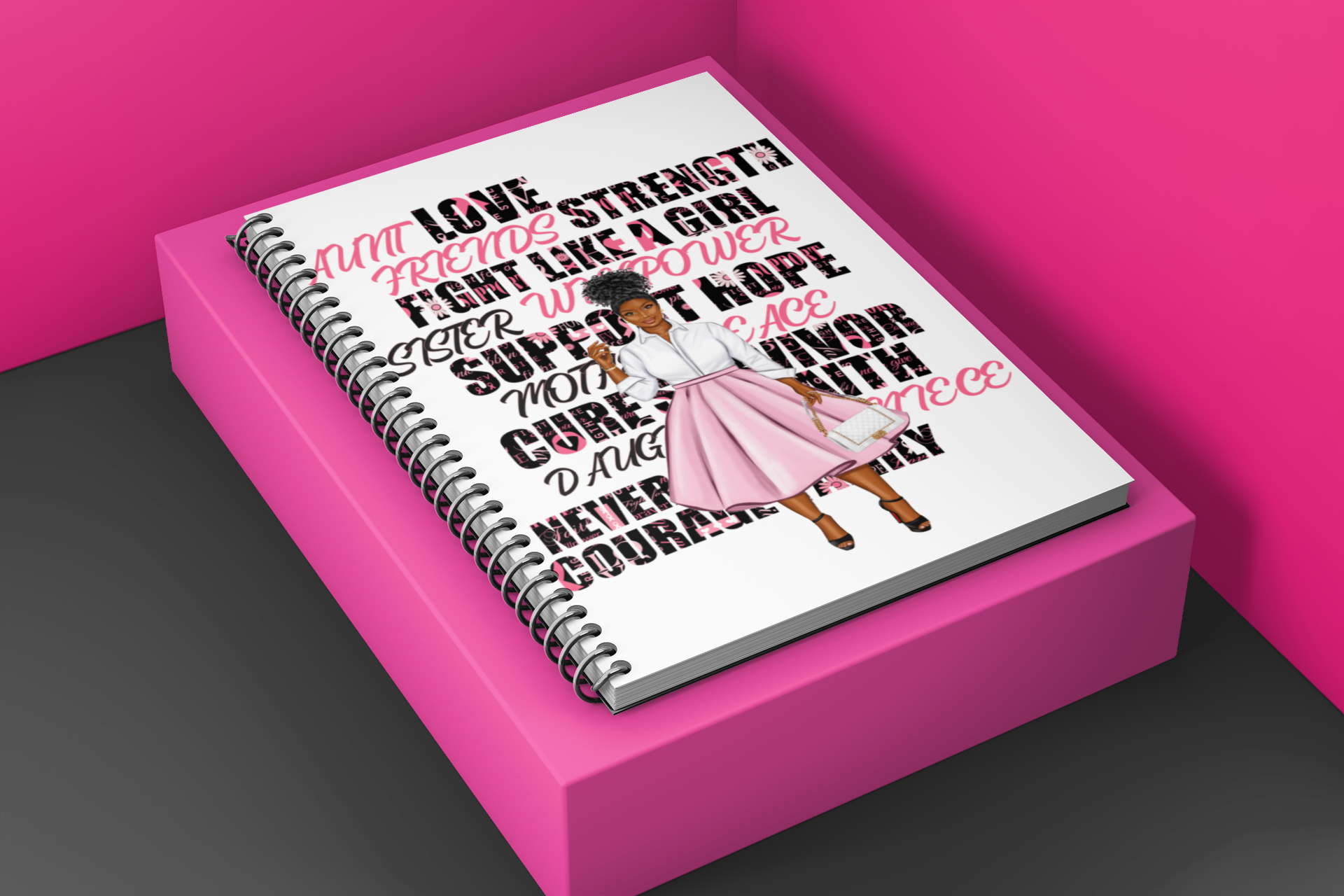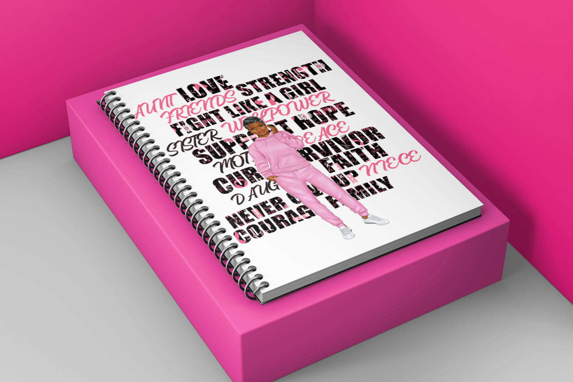 This set consists of 3 pieces to gift to a friend or loved one during their fight for a cure. Set includes a white t shirt with logo design, matching mask (not pictured) and a notebook/journal to write down all thoughts, appointments, etc.