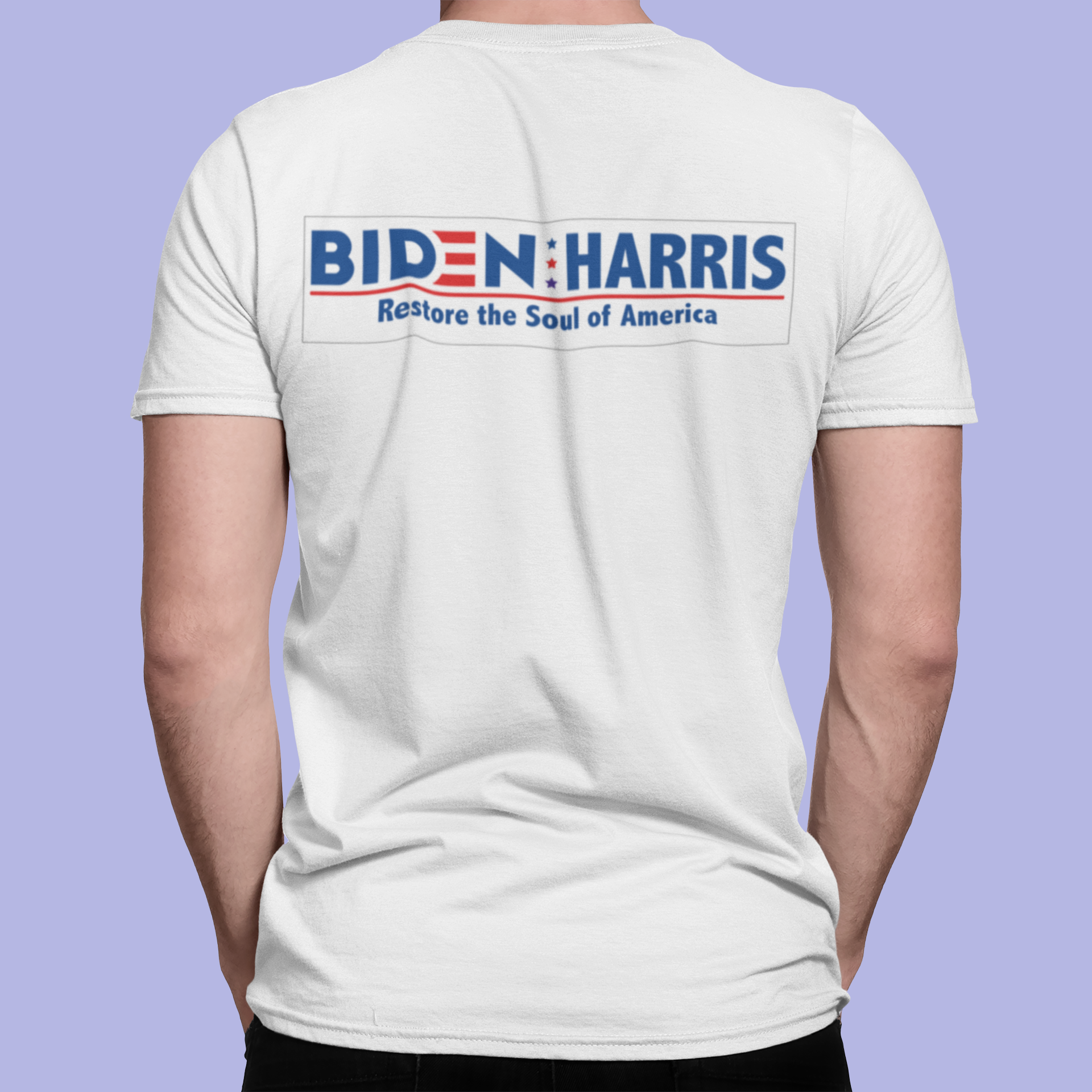 President elect Joe Biden/Harris white short sleeve t shirt. Available for women in v-neck style and men crew neck. Womens v neck shirts are a snug fit as the mens are a sure fit. Available in white only.