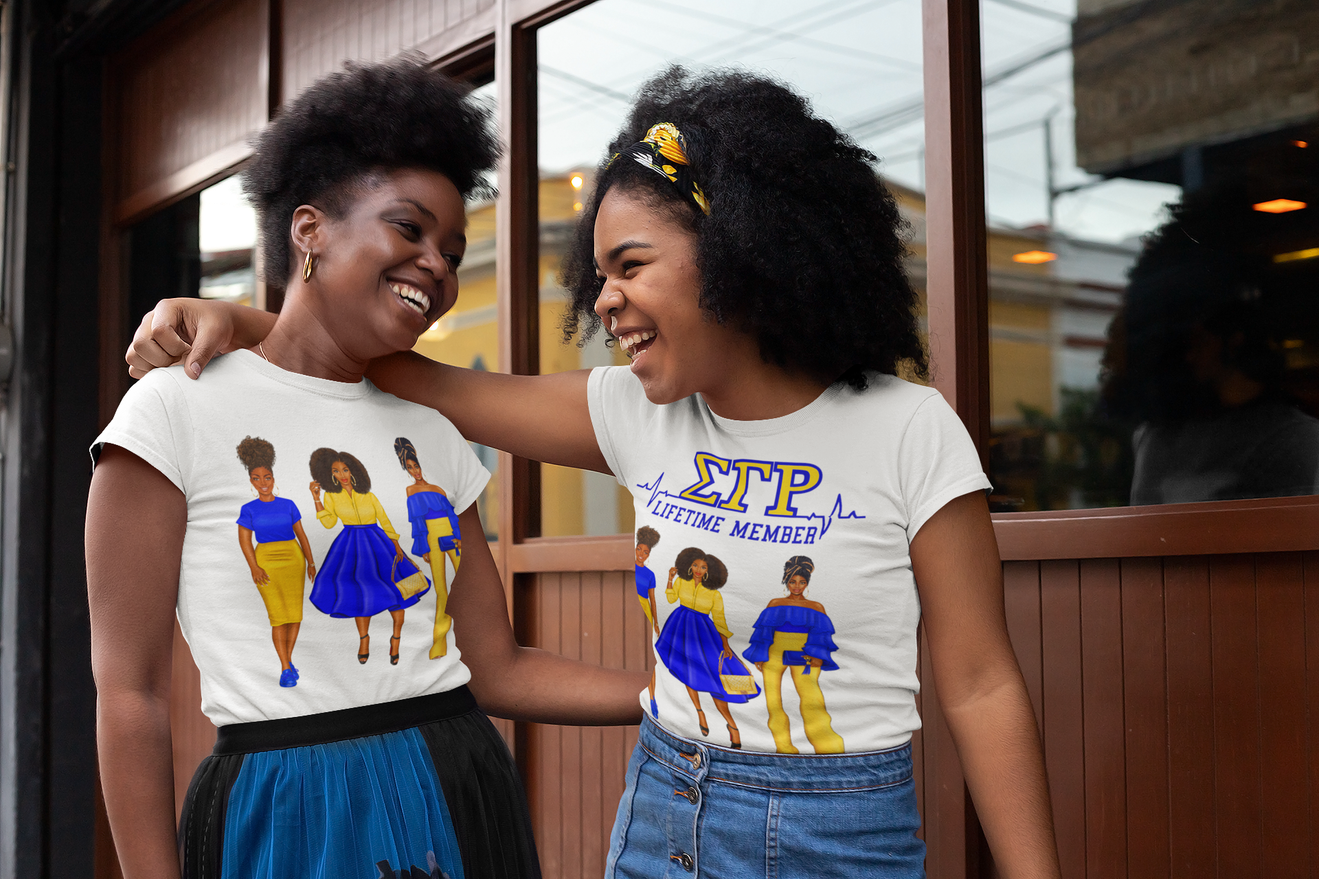 Our models are each wearing the inspired colors of the Sigma Gamm Rho sorority. Shirts are available in a WHITE v -neck style only.