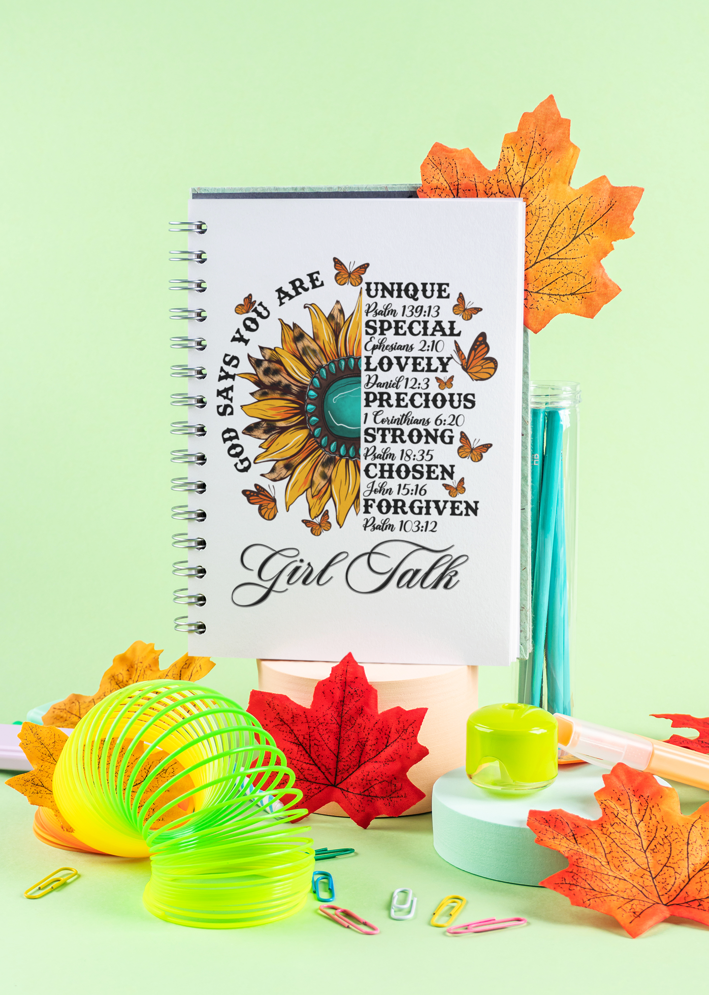 Order includes 5.8x8.5in custom spiral "GIRL TALK" journals and "GIRL TALK" keychains.